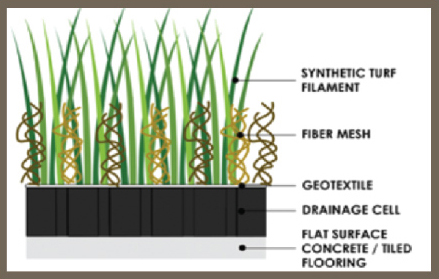 This method do not require an infill. ideally this is suited for indoor & outdoor, vertical or slope turf application for a better drainage system. A permeable geotextlle ls layered beneath to drain any fluid directly into the cell. |